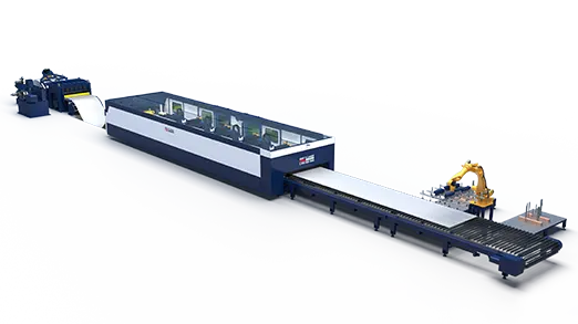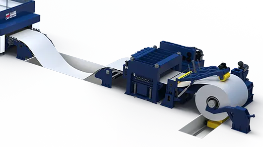 Streamlines remnant material recycling. Crawler-type cutting table equipped with needle plate cutting strips. During sheet metal processing, the cutting table operates synchronously and at the same speed as the uncoiling servo feeding system. The crushed scrap skeleton is discharged via a scrap conveyor belt, the scrap skeleton breaks into smaller pieces during removal and can be productivity many times over.