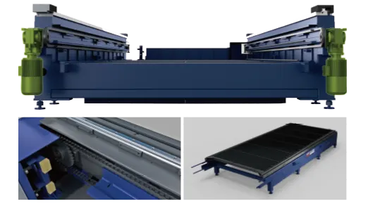 ● Using high-tensile strength chain, two tables can pull out of cutting area at the same time.